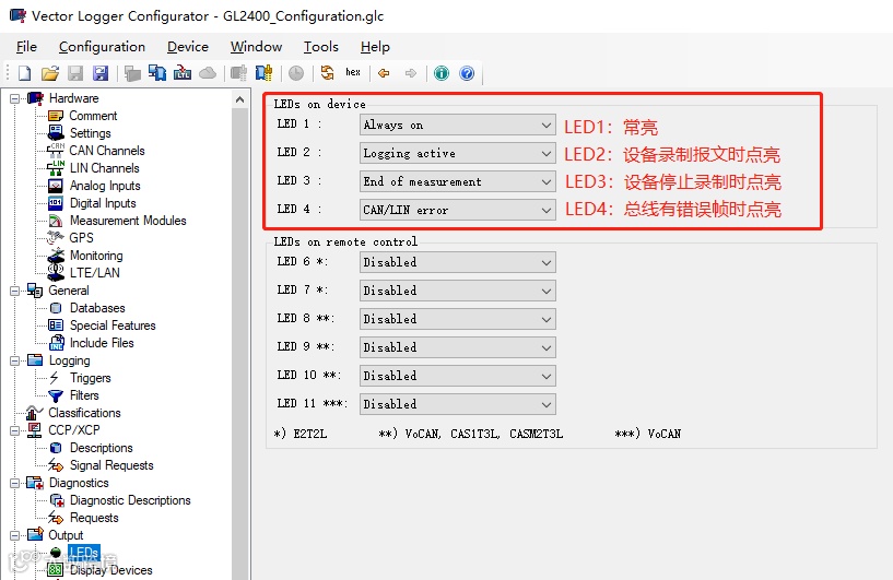 ▷ 选中Output-LEDs,配置设备上LED点亮方式,指示当前录制状态。