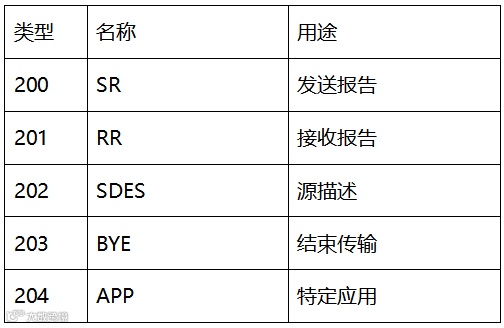 RTCP可划分成五种类型,如下表所示: