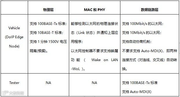DoIP物理连接和数据链路层要求如下表: