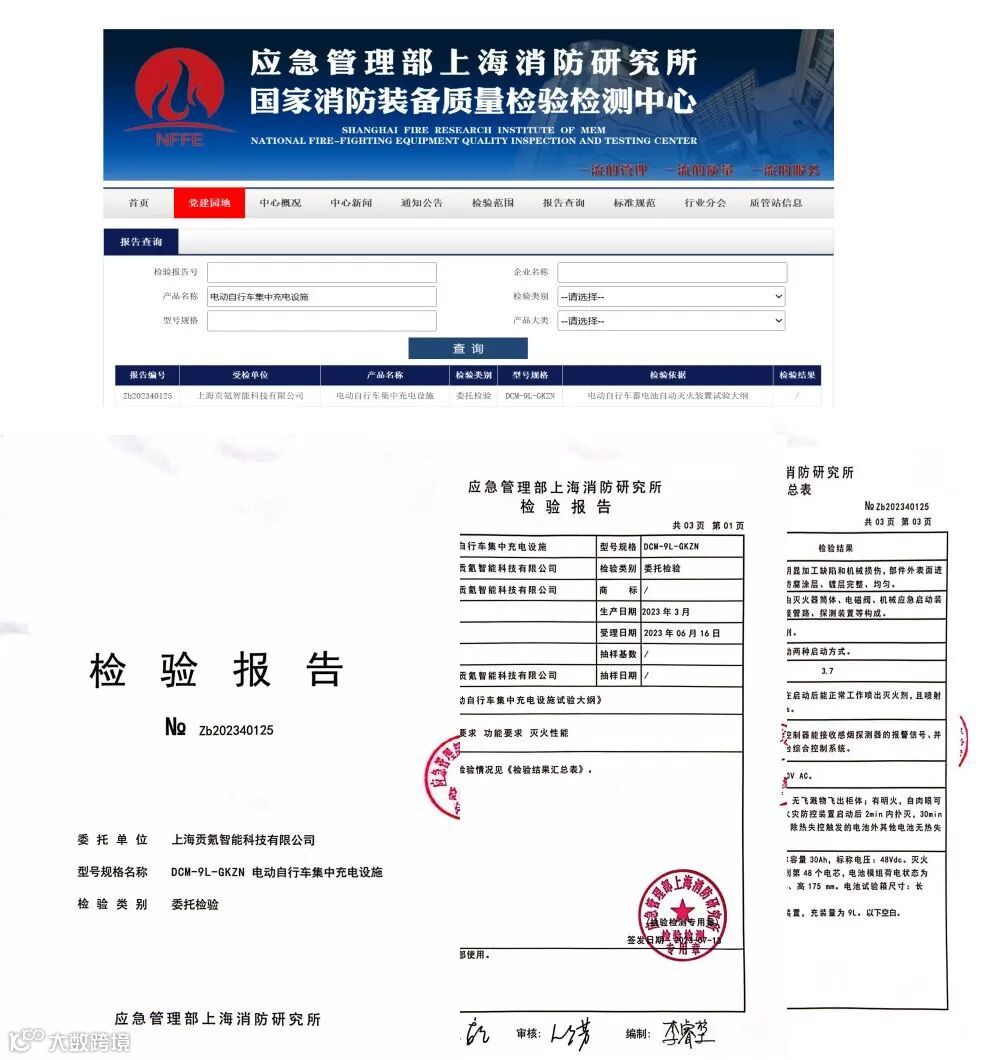 上海贡氪智能科技有限公司自主研发的电动自行车集中充电设施获得国家消防检测机构(应急管理部上海消防研究所)的检测并取得检验报告(报告编号:Zb202340125)。