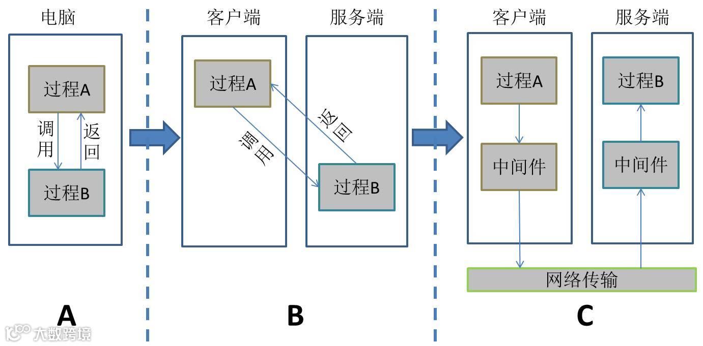 面向服务的通信,顾名思义,这种通信是为了对服务的相关信息进行传输。服务是什么呢?简单理解就是某一段代码所能够提供的某些功能。比如你在餐厅点餐,服务员(Server)就提供了一种“点餐”的服务(Service),你作为一个客户(Client),就能够使用这些服务。服务的相关信息有哪些呢?就是各种属性信息、控制信息等内容。如果服务与服务使用者同在一台电脑上,那么可以直接通过程序接口实现过程调用,如图中A区域所示。但是如果服务与服务使用者位于不同的电脑,则需要进行远程调用,如图中B区域所示。在远程调用时,就需要借助中间件及网络传输实现信息传输,如图中C区域所示,这种通信就是面向服务的通信,就是要通过一定的方式对服务的相关信息进行打包,打包后再把这些信息在网络上进行传递。