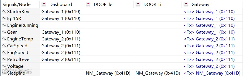 在这种传输情况下最核心的就是通信矩阵,在通信矩阵中以信号作为主要对象,体现出信号被封装到哪条报文中,信号被哪个节点发送,被哪个节点接收。