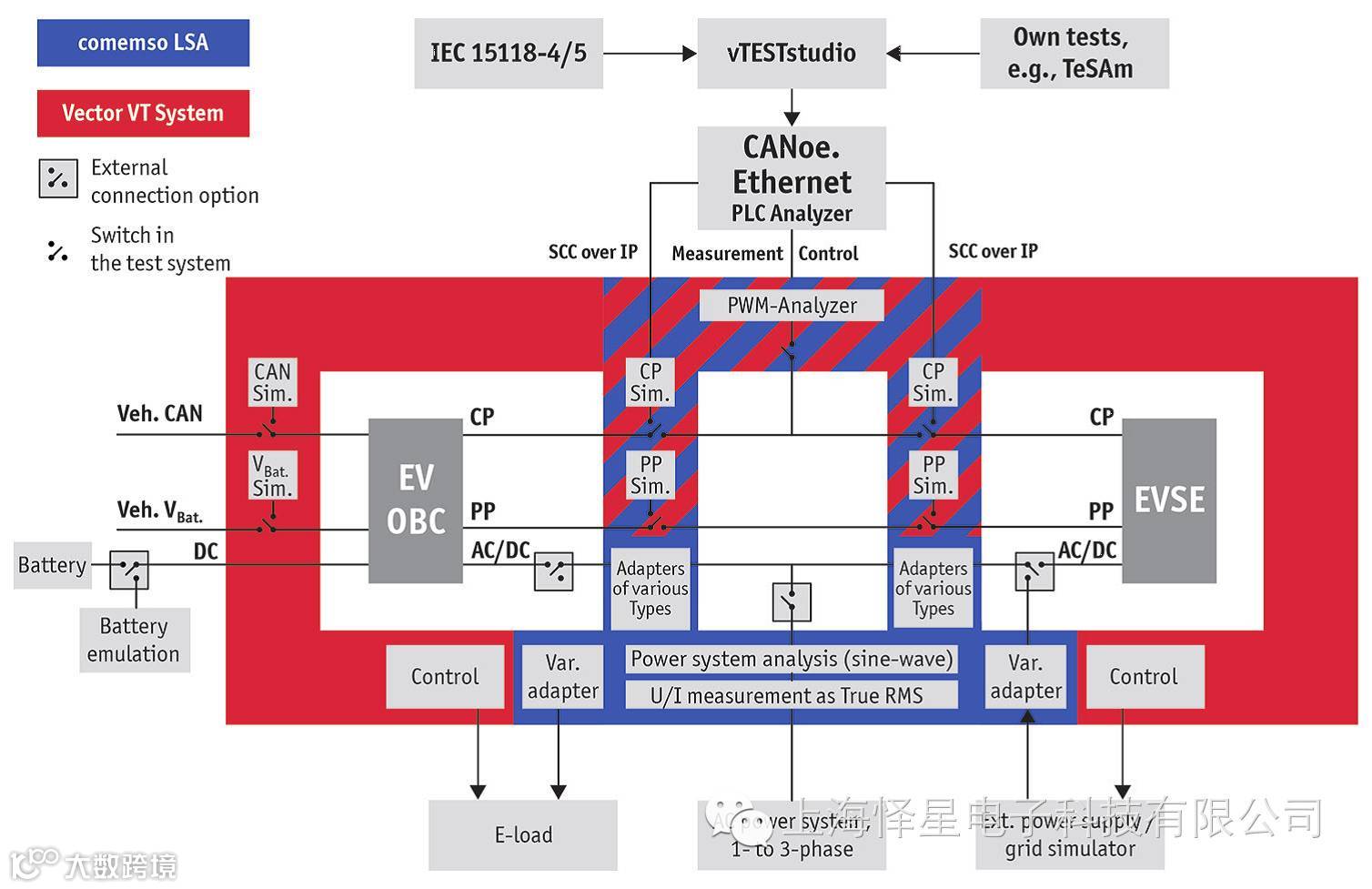 对于EVSE测试,需要仿真车辆,也需要连接到真实的或仿真的电网系统(电网仿真器),必要的情况下,仿真互联网环境