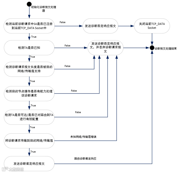 路由激活完成之后,诊断仪即可以通过该TCP_DATA Socket与ECU进行诊断通信,同样在ECU接收到诊断请求后会按照下图所示流程进行判别处理,若所有判别均满足要求,ECU会回复诊断肯定响应及诊断响应报文,或者向目标网络转发该诊断请求。