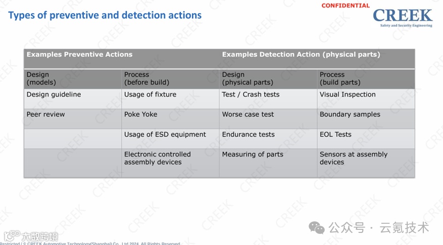 主要讲述了预防措施和探测措施的实施。预防措施主要在开发阶段进行,通过规范和评审等方式防止失效的发生;探测措施则是在产品完成之后,通过测试等手段检测出故障。