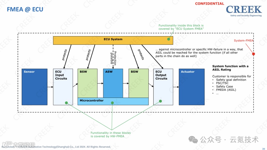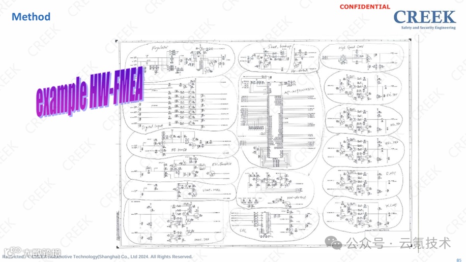 是如下图的Block层级,还是精确到电阻电容等元器件层级。基于云氪的项目经验是不建议做到元器件层级,可以在Block层级和元器件层级之间找到一个平衡点,一般考虑硬件FMEA往往都是功能安全项目,功能安全项目ASILB以上做FMEDA,在进行FMEDA时就会要做eFMEA,已经到元器件层级。
