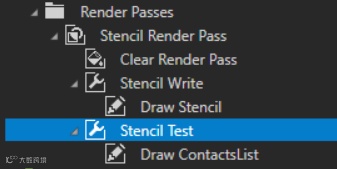 e)创建管道状态渲染通道Stencil Test,设置相关属性,创建绘图对象渲染通道Draw Contacts List,设置对象源属性为Content Filte标签过滤器。Kanzi将渲染Scene中的所有节点,Stencil节点除外。