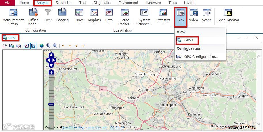 Step 7:打开CANoe/CANalyzer,在Analysis里面找到GPS,在GPS Configuration新建地图;