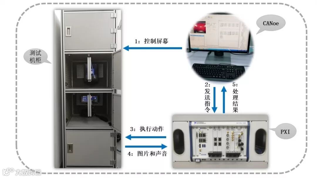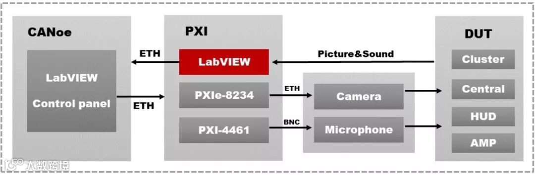 用户在CANoe中发送控制指令,通过网络传递给PXI设备,LabVIEW程序根据收到的指令控制板卡去执行相应的动作(图标识别或声音识别等),最后将LabVIEW程序处理完的结果通过网络回传给CANoe,用户在CANoe环境下可轻松进行系统测试。