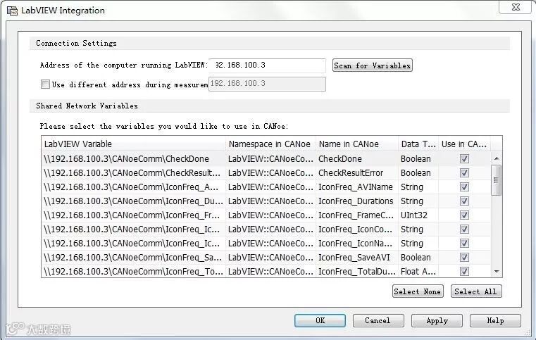 然后在Environment选项中选择LabVIEW Configuration配置PXI设备的IP地址,下方的列表框中将显示所有检测到的可关联的LabVIEW网络变量。用户可在CANoe中通过这些系统变量控制程序进行各种屏幕图像操作。