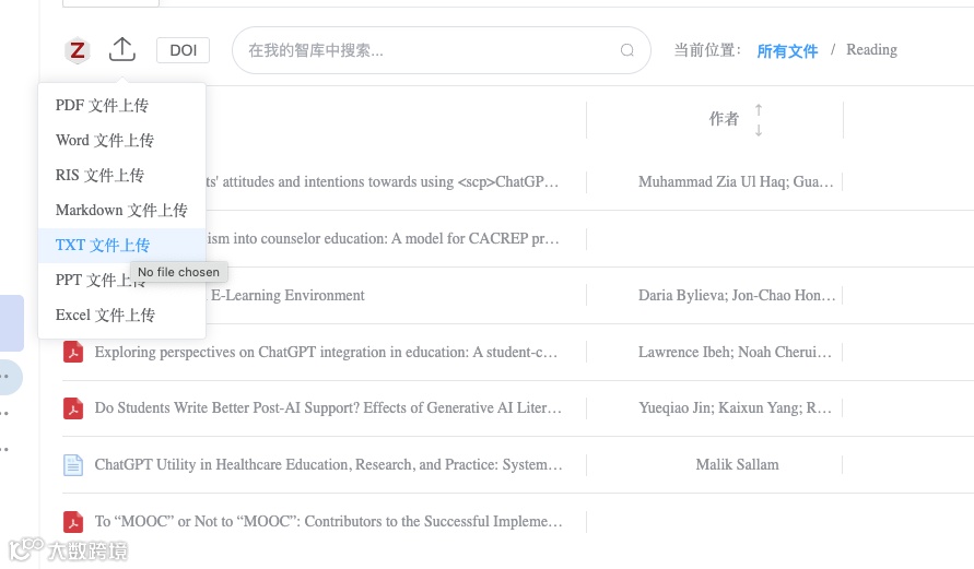 我们同样支持在智库中上传上述格式的文件,本次新增了TXT格式的文件上传及阅读: