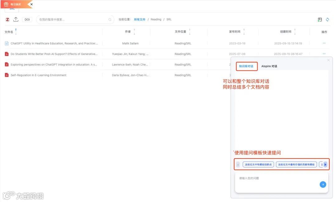现在,您可以针对知识库中的内容(即下图中某个文件夹中的所有文件列表)进行智能提问,让AI帮您快速梳理研究方向、总结要点、提炼创新。