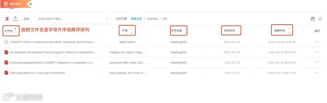 现在智库支持按发布时间、名字、路径、创建时间等多种方式进行排序,并在浏览文件时,鼠标悬停未展示完全的字段(比如标题、作者部分)即可查看完整信息,操作更便捷,体验更流畅。