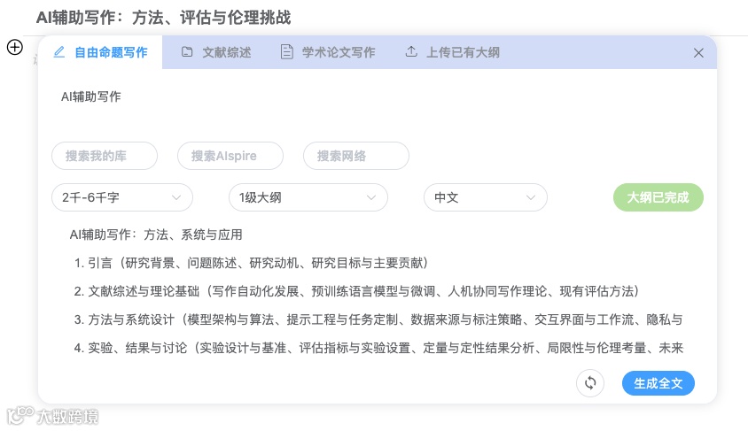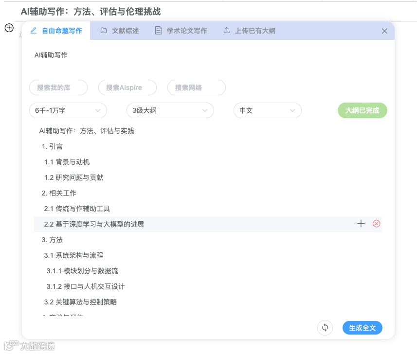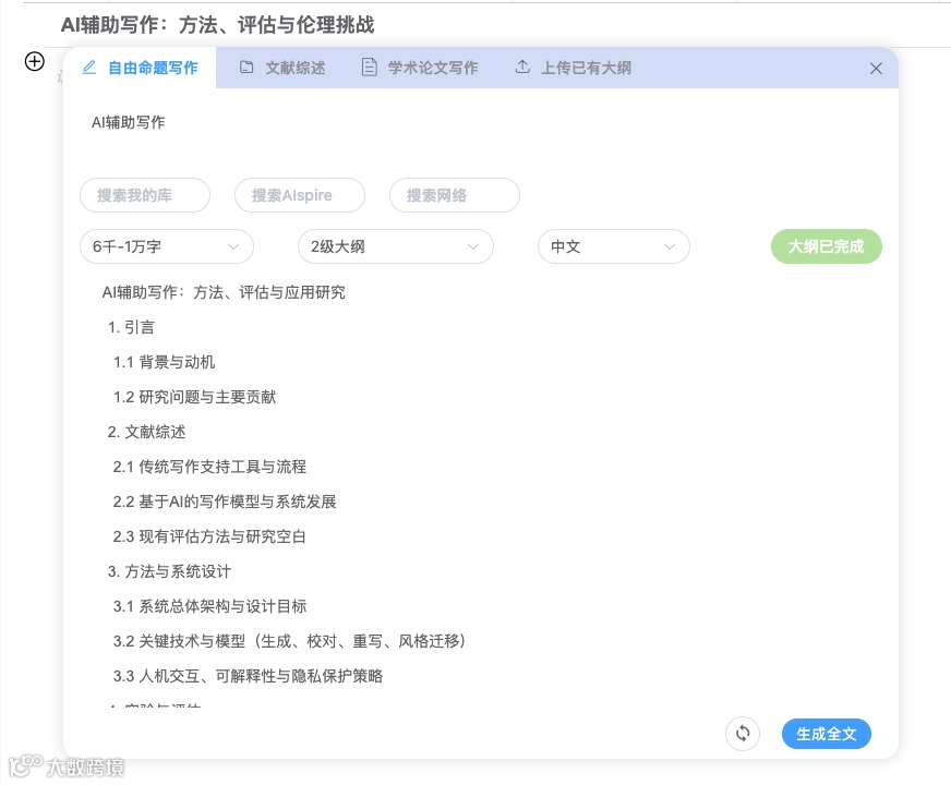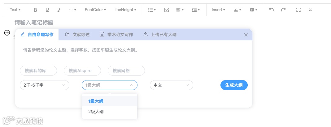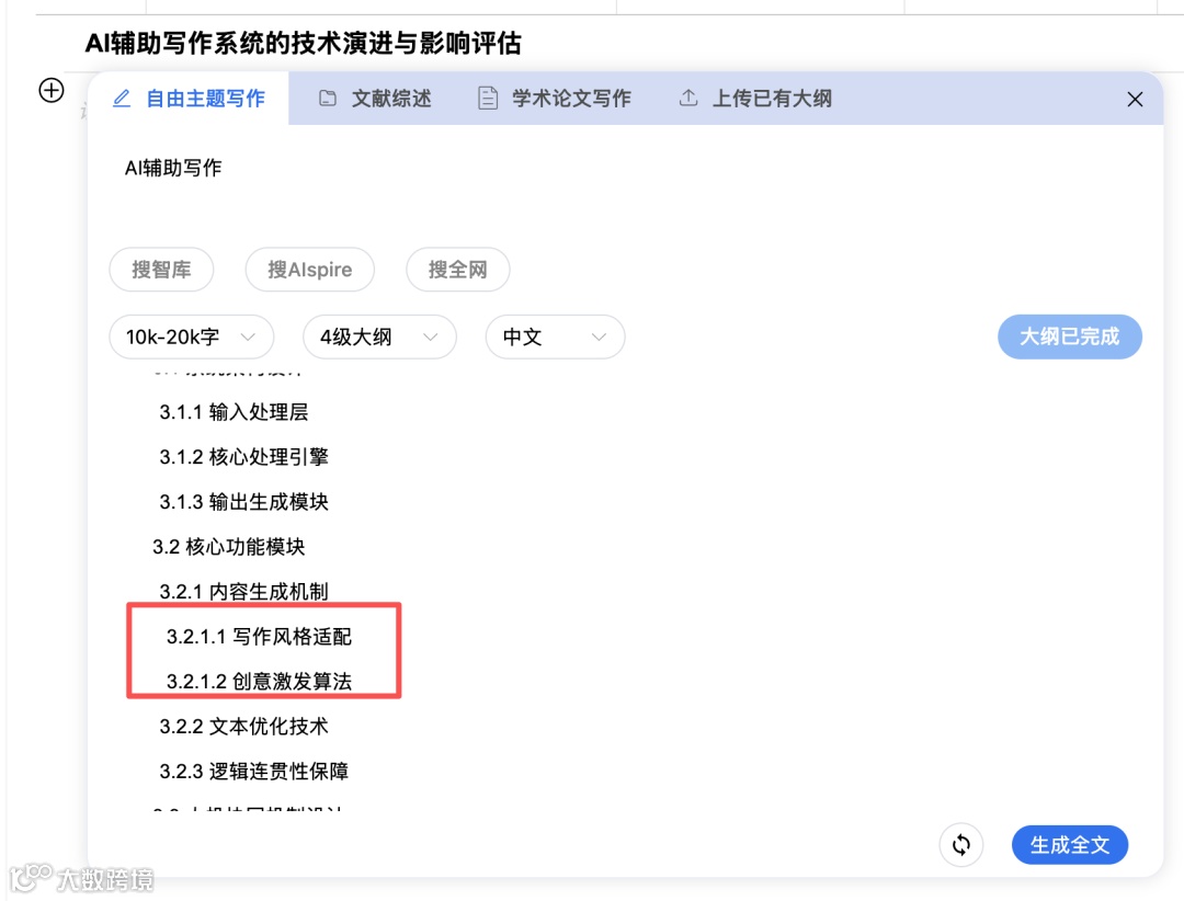 为此,升级后的AIpsire「写作」功能特别设计了分级大纲体系。 系统会根据设定选择的文章的字数自动推荐合适的层级范围,让结构更自然: