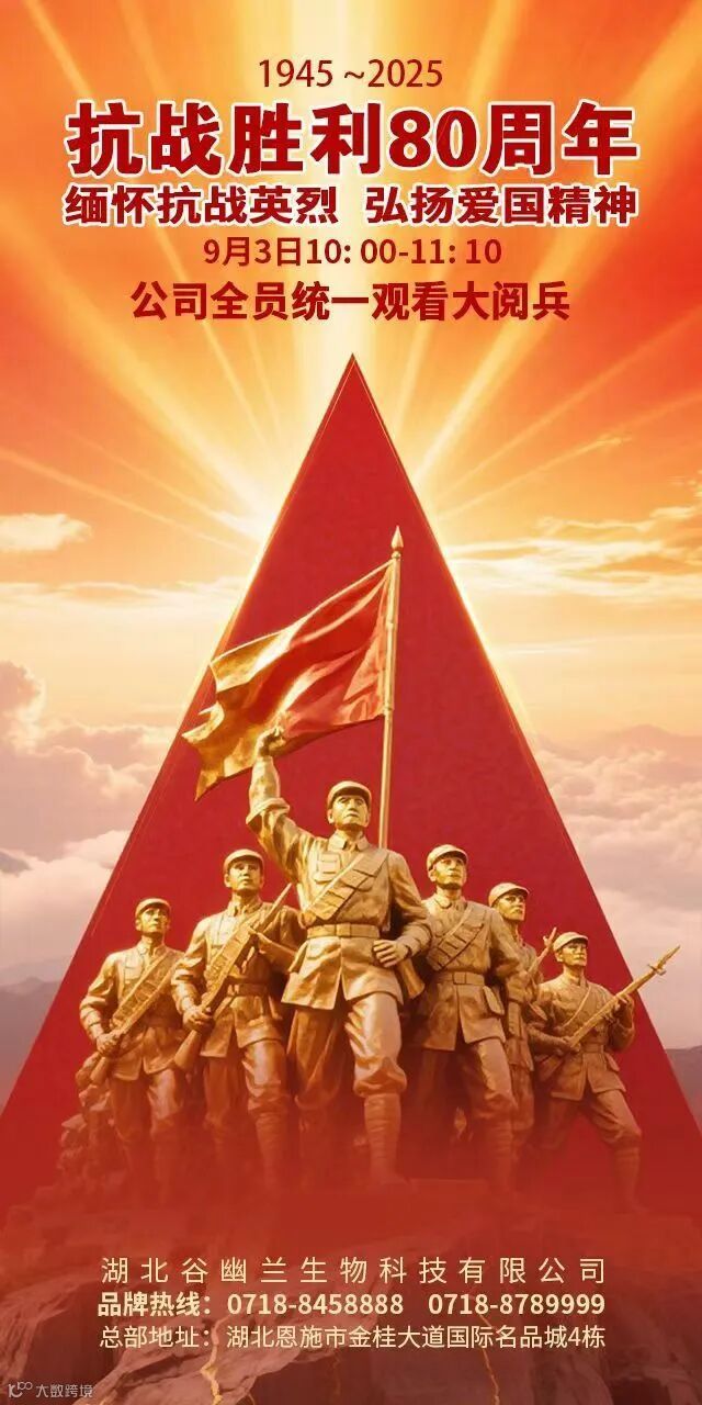 2025年9月3日,是中国人民抗日战争暨世界反法西斯战争胜利80周年纪念日。为纪念中国人民抗日战争暨世界反法西斯战争胜利80周年,弘扬爱国主义精神,厚植家国情怀,湖北谷幽兰生物科技有限公司特组织全体员工集中观看“九三”阅兵式,引导职工铭记历史、缅怀先烈。