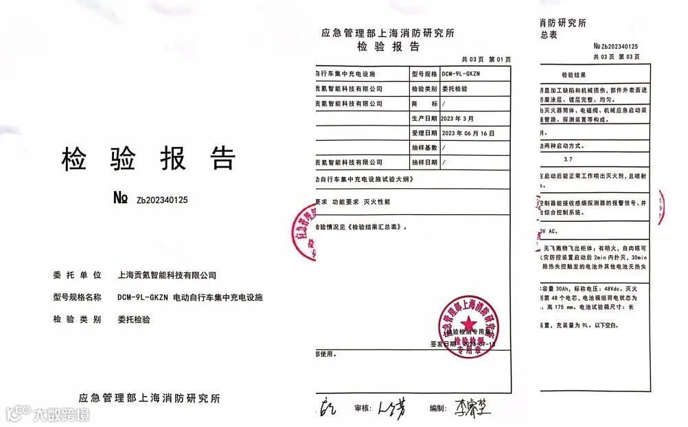 智能充电柜通过国家消防检测机构(应急管理部上海消防研究所)的检测并取得检验报告(报告编号:Zb202340125)。
