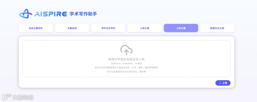 上传文章——如果您已经写了部分或者写完了,可以导入进行ai辅助优化。 -