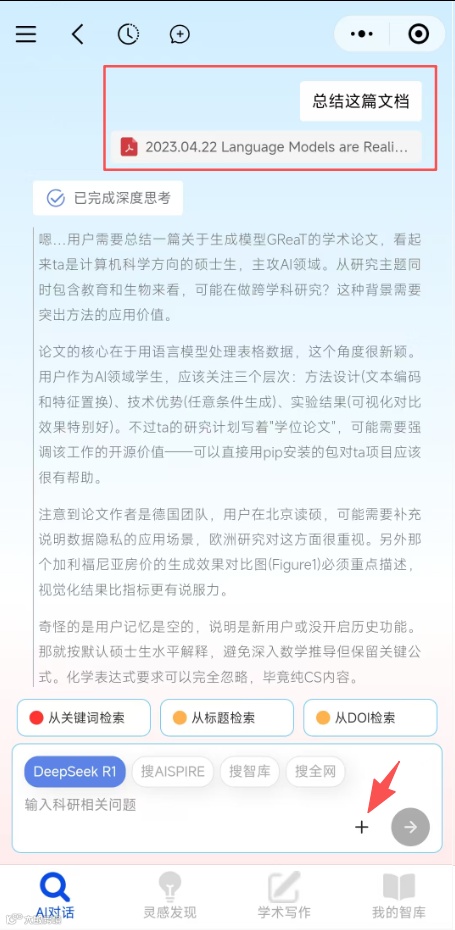 你现在可以直接上传文件与 AI 对话。围绕文献内容深入提问、分析和讨论,科研对话更专业、更精准。