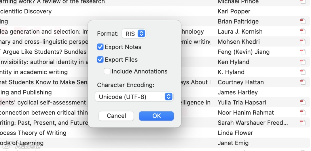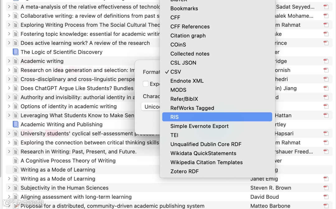 在弹窗中选择导出格式RIS。