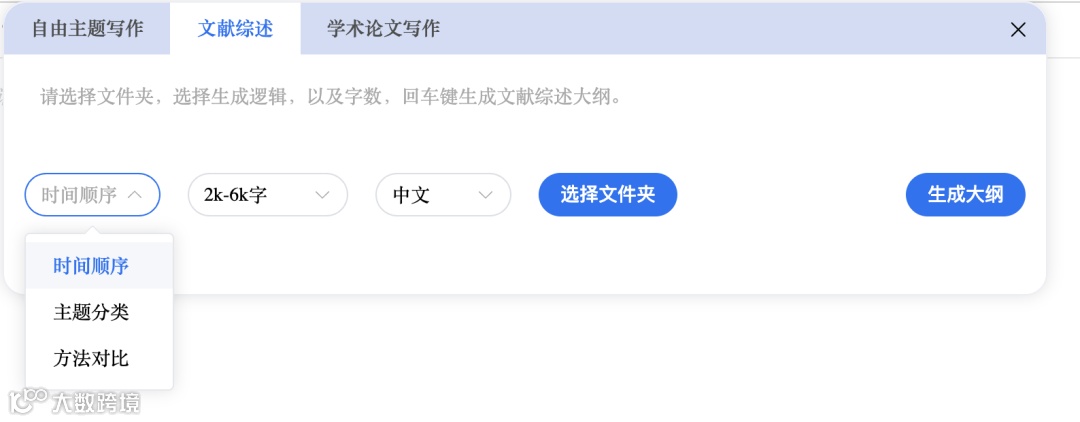 精准聚焦: 输入关键词或让AI自动归纳主题,锁定综述方向。灵活选择结构逻辑:时间脉络 (Chronological)、主题聚类 (Thematic)、方法对比 (Methodological Comparison) 任你挑选(未来将拓展更多结构)。