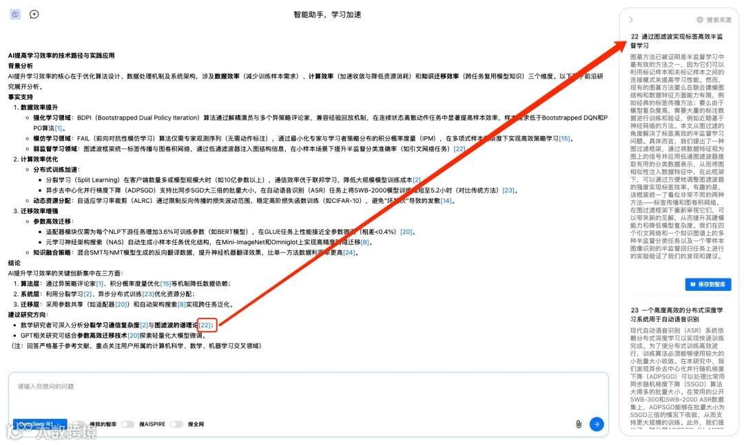 参考文献,点击即达当你勾选“搜索我的智库”、“搜索 AIspire”后,AIsipire的回复中会显示相关的文献引用信息(如果有的话)。生成过程中,点击引用数字即可跳转到文献原文;在对话历史中,同样可以一键查看引用来源。 ——让知识可追溯,让回答更有“出处”。