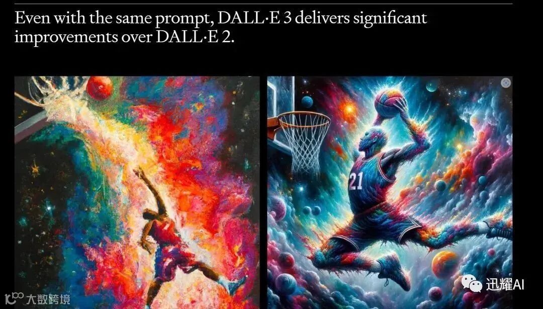 令人信服的表现常常需要实例加以佐证。以"一个篮球运动员扣篮的生动油画,就像星云爆炸一样炸裂"为触发词,使用DALLE-2的结果可能会显得模糊不清,无法传递出这种震撼力。