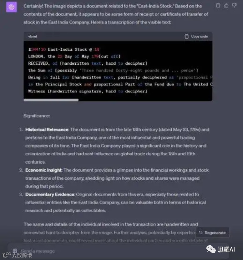 还有一次,我给了它一份字迹难以辨认的历史文献,它很好地破译了其中的文字。它还详细指出了文件的重要意义。GPT-4 的视觉功能有很多不可思议的应用案例,您可以尽情探索。
