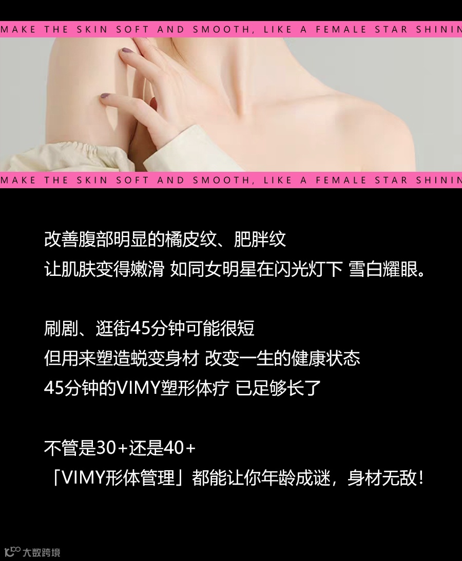 VIMY体塑采用原装进口仪器,提供定制化、非侵入式、无创无痛、安全舒适的形体管理服务,全方位塑造性感与健康之美!为万千女性打造健康且充满活力的动人曲线!