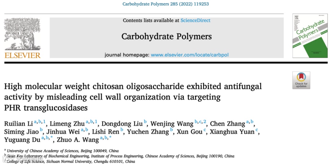 2022年2月19日,中国科学院过程工程研究所糖生物工程课题组杜昱光研究团队以“Highmolecular weight chitosan oligosaccharide exhibited antifungal activity bymisleading cell wall organization via targeting PHR transglucosidases”为题,在Carbohydrate polymers杂志上在线发表了研究论文,以临床中常见的条件致病真菌白色念珠菌及其生物膜为研究对象,围绕着壳寡糖抗真菌的构效关系、作用靶点、作用机制展开了系统性的研究,提出特定结构壳寡糖可作为真菌细胞壁结构类似物参与细胞壁组装,破坏细胞壁结构从而发挥抗真菌活性,并首次发现分离了壳寡糖在白色念珠菌细胞壁中的主要结合靶点。中国科学院过程工程研究所李瑞莲博士生为第一作者,中国科学院过程工程研究所杜昱光研究员,王倬副研究员为通讯作者。