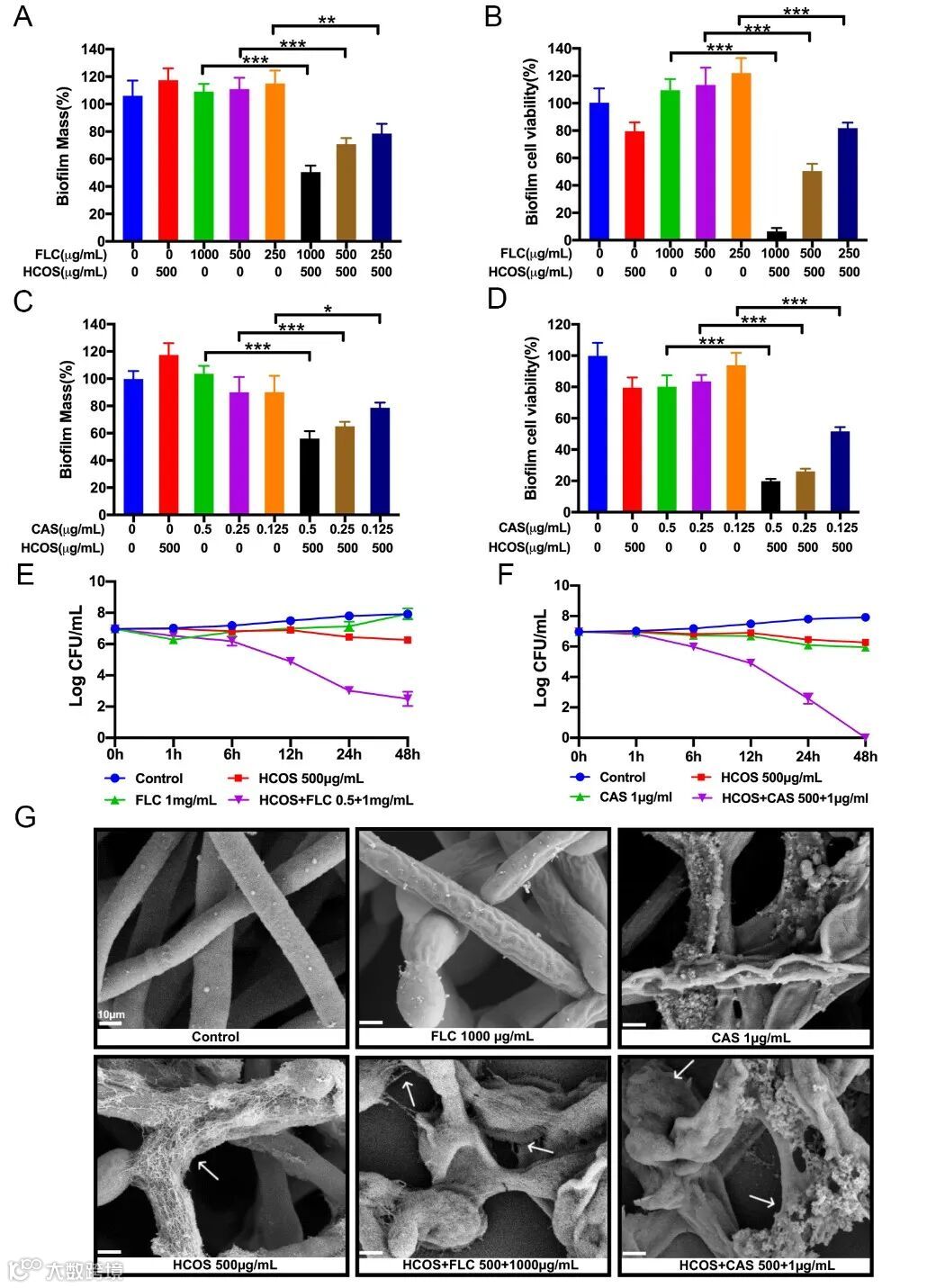 因此,作者继续评价了HCOS与两种临床一线抗真菌药物氟康唑、卡泊芬净联合使用对5种念珠菌的抗菌活性,结果如图6所示,HCOS可以作为抗真菌药物增效剂,将药物的最低抑菌浓度(MIC)降低16-32倍,并可以彻底清除白色念珠菌生物膜内部的耐药细胞,其协同增效机制是HCOS通过破坏真菌细胞壁结构,加速药物进入细胞。
