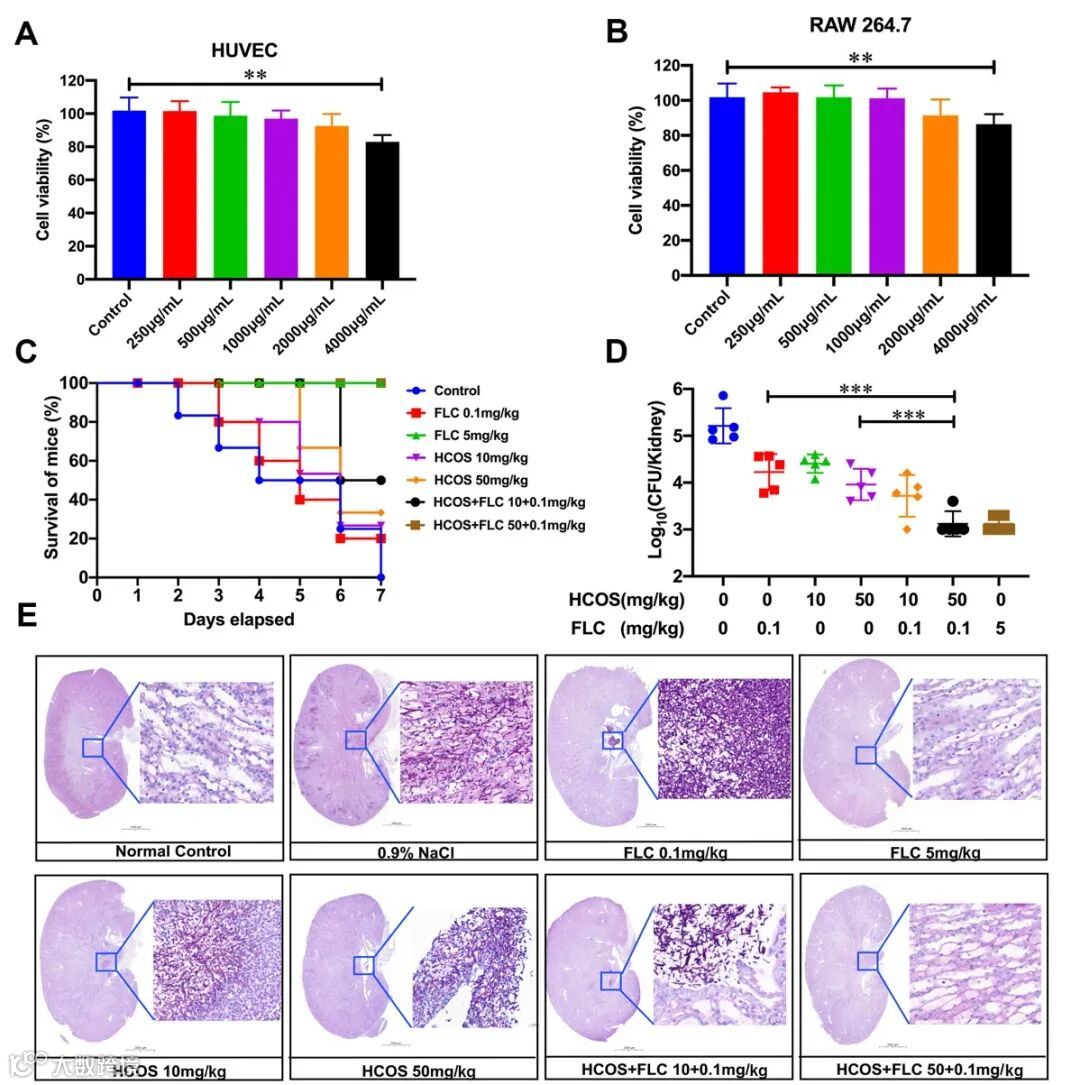 构建小鼠念珠菌菌血症模型,将氟康唑进行腹腔注射同时将HCOS灌胃给小鼠治疗7天,通过小鼠的存活率和肾脏中真菌的负荷量来评价HCOS与氟康唑联用是否具有协同作用,结果如图7所示,HCOS与FLC联用可提高念珠菌菌血症小鼠存活率,降低肾脏中真菌负荷量,甚至可以将FLC的用药量降低50倍。证明HCOS与抗真菌药物联合使用是一种针对念珠菌感染的有效治疗策略。