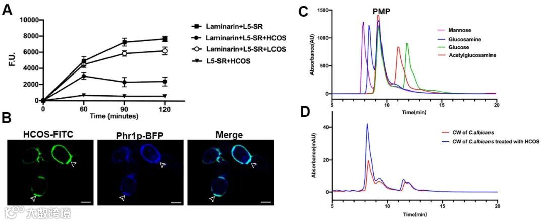 如图4A所示,通过亲和层析的方法分离了HCOS在白色念珠菌细胞壁中的特异性结合靶点,通过质谱鉴定,结合力分析(图4C-H),基因转录水平变化(图4I-K)等方面证明GH72 PHR 家族中的Phr1p是HCOS在白色念珠菌细胞壁表面发挥抗真菌活性的结合靶点。Phr1p是具有转糖苷活性的葡聚糖水解酶,负责真菌细胞壁主要组分葡聚糖链的延长分支,但PHR家族与几丁质/壳聚糖/壳寡糖的关系未见报道。