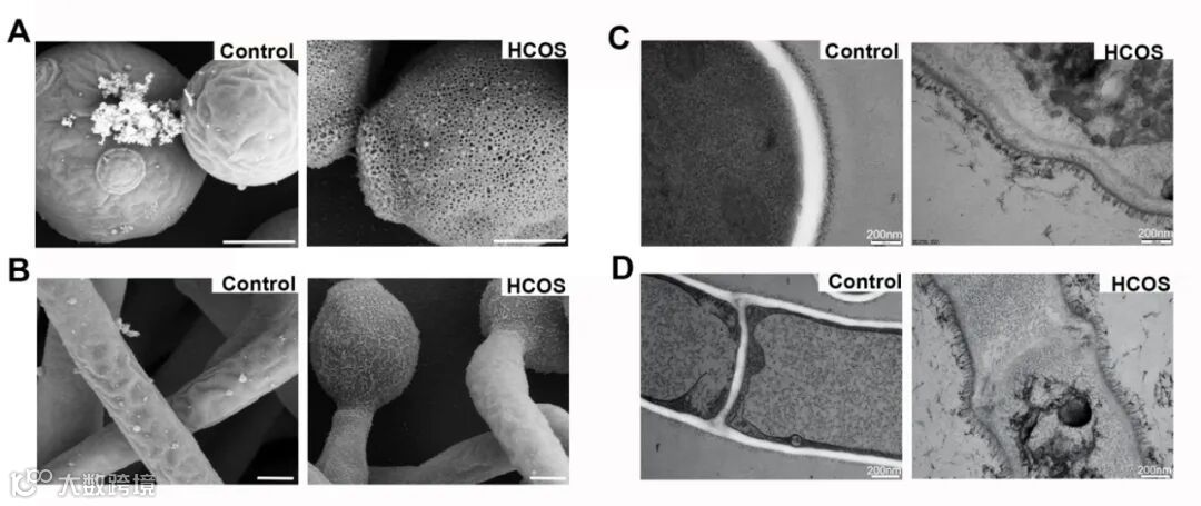 确定了HCOS靶向于白色念珠菌细胞壁后,继续通过扫描电镜和冷冻透射电镜对白色念珠菌的表面结构和细胞壁超微结构进行观察,如图3A所示,HCOS处理后,白色念珠菌表面产生密集的孔状结构,使得原本致密坚韧的细胞壁结构变得疏松多孔,细胞渗透压变化最终导致菌体死亡。图3C的超微结构也显示HCOS处理后白色念珠菌细胞壁和细胞膜的界限不清晰,原本富有弹性坚韧的细胞壁在HCOS的作用下出现皱褶,说明HCOS对白色念珠菌的细胞壁结构产生显著的破坏作用。