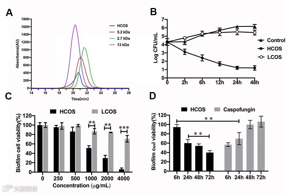 首先通过对不同结构壳寡糖的抗真菌活性进行评价,如图1所示,筛选到一种水溶性的高分子量壳寡糖HCOS(Mw= 5 kDa),其对浮游态和生物膜态白色念珠菌都能够发挥良好的抗真菌活性。而低分子量的壳寡糖LCOS(Mw=800Da)对浮游态和生物膜态的白色念珠菌均没有显著的抗菌活性,筛选到这两种有显著活性差异的壳寡糖可以继续进行壳寡糖抗真菌构效关系的探究。