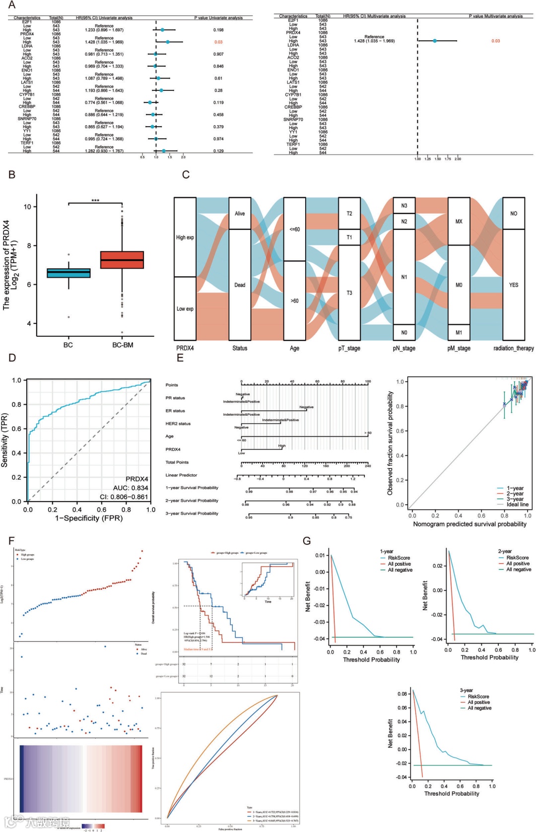 A为Cox回归分析森林图;B为PRDX4在乳腺癌和乳腺癌骨转移组的表达箱线图;C为临床信息桑基图;D为PRDX4诊断ROC图;E为PRDX4预后列线图和校准图;F为风险因子、KM曲线、时间依赖性ROC;G为DCA决策曲线。