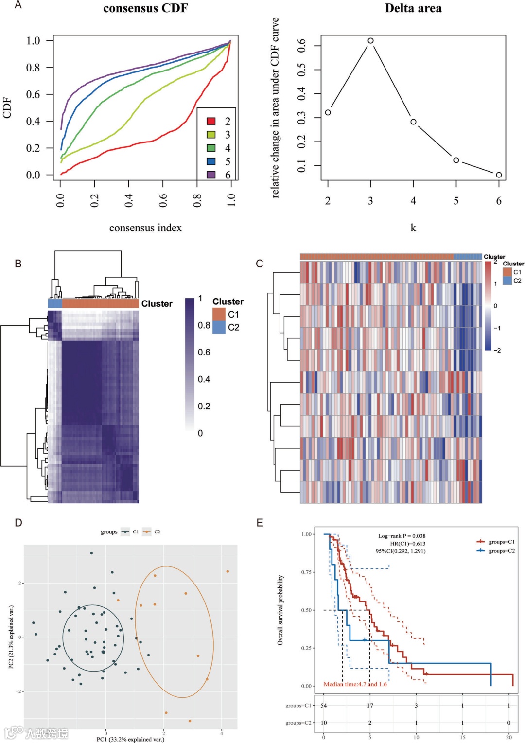 A为共识聚类的CDF曲线和delta面积曲线;B为k=2时的分子亚型鉴定结果;C为C1、C2亚型的DEGs热图;D为两个亚型的PCA图;E为两个亚型的KM生存曲线。