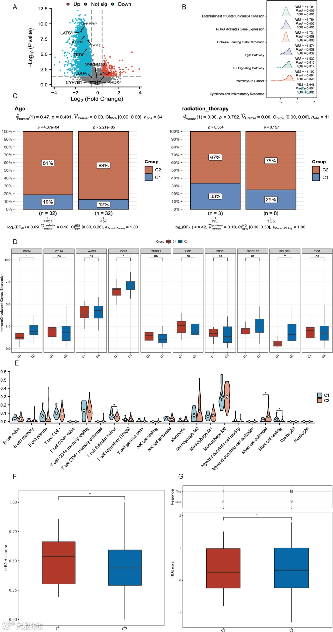 A为C1、C2亚型的火山图;B为亚型间GSEA富集分析;C为临床信息差异;D为免疫检查点表达差异;E为免疫浸润差异;F为肿瘤干性评分差异;G为TIDE评分差异。