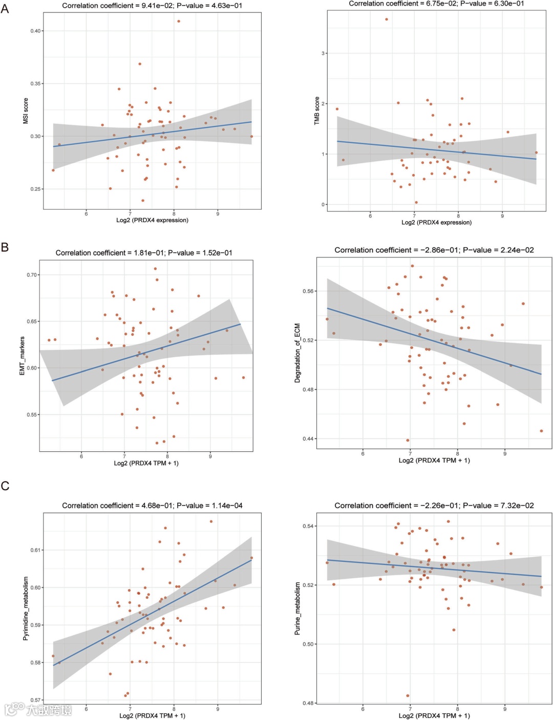 A为PRDX4与MSI、TMB评分的相关性;B为PRDX4与EMT、ECM降解评分的相关性;C为PRDX4与嘧啶代谢、嘌呤代谢的相关性。