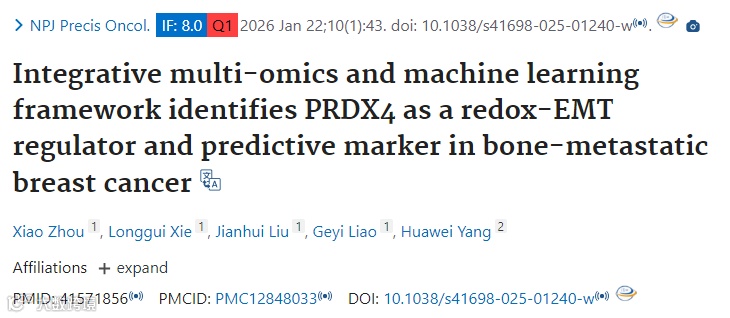 总体而言,该研究构建的多组学+机器学习分析框架为肿瘤转移相关生物标志物的发现提供了可复制的研究范式,PRDX4作为核心靶点也为乳腺癌骨转移的精准诊断和靶向治疗开辟了新方向,具有重要的理论价值和临床转化潜力。