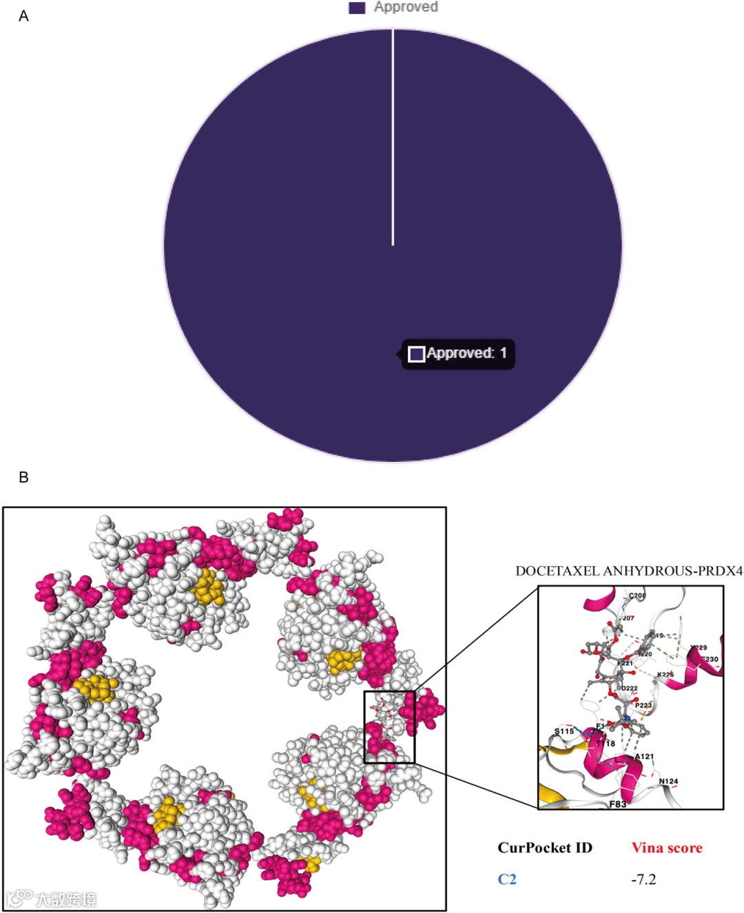 A为DGIdb数据库筛选出的PRDX4潜在治疗药物;B为多西他赛无水物与PRDX4的分子对接验证结果(结合口袋、Vina评分)。