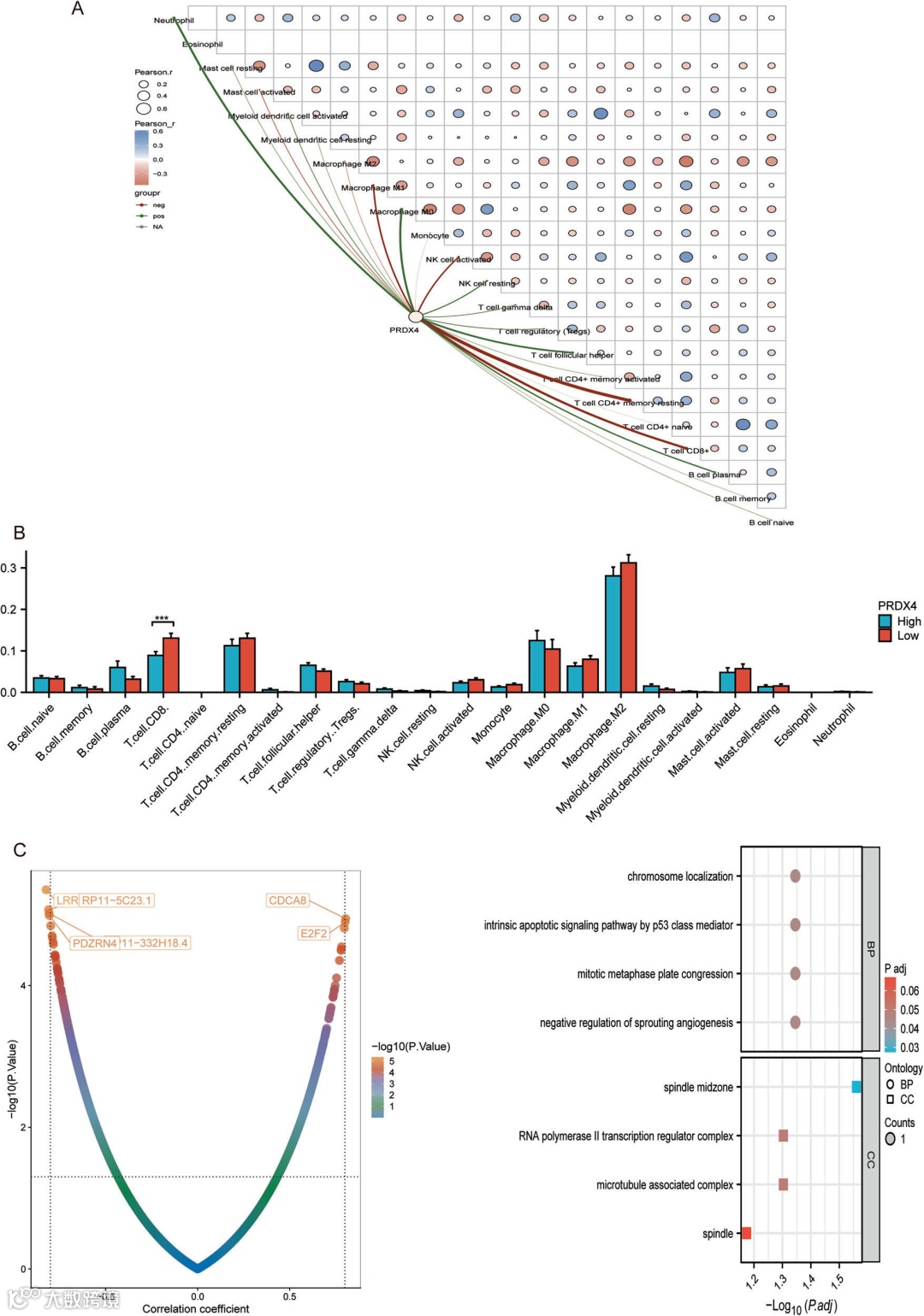 A/B为PRDX4与免疫细胞浸润的关联分析;C为PRDX4共表达基因的热图及KEGG、GO富集分析。