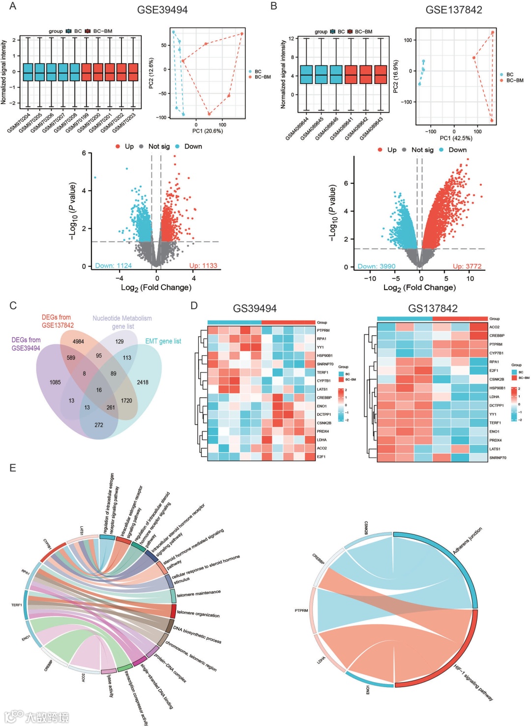 A/B为GSE39494、GSE137842数据集的箱线图、PCA图、火山图;C为Venn图展示EMT、NM与两个数据集DEGs的交集;D为热图展示16个核心EMT-NM DEGs的表达;E为16个DEGs的KEGG和GO富集分析结果。