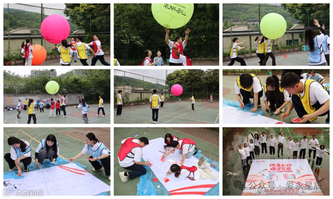 午餐过后,小伙伴们分三组练习并开展了健球趣味比赛,1.2米的大球给小伙伴们带来了合作共赢的启发与思考。运动过后,大家在密切配合中,开始制作团队巨画。虽然在巨画即将完成的最后几分钟,运动场下起了大雨,但大家仍相互支持,完成了巨画的交付!