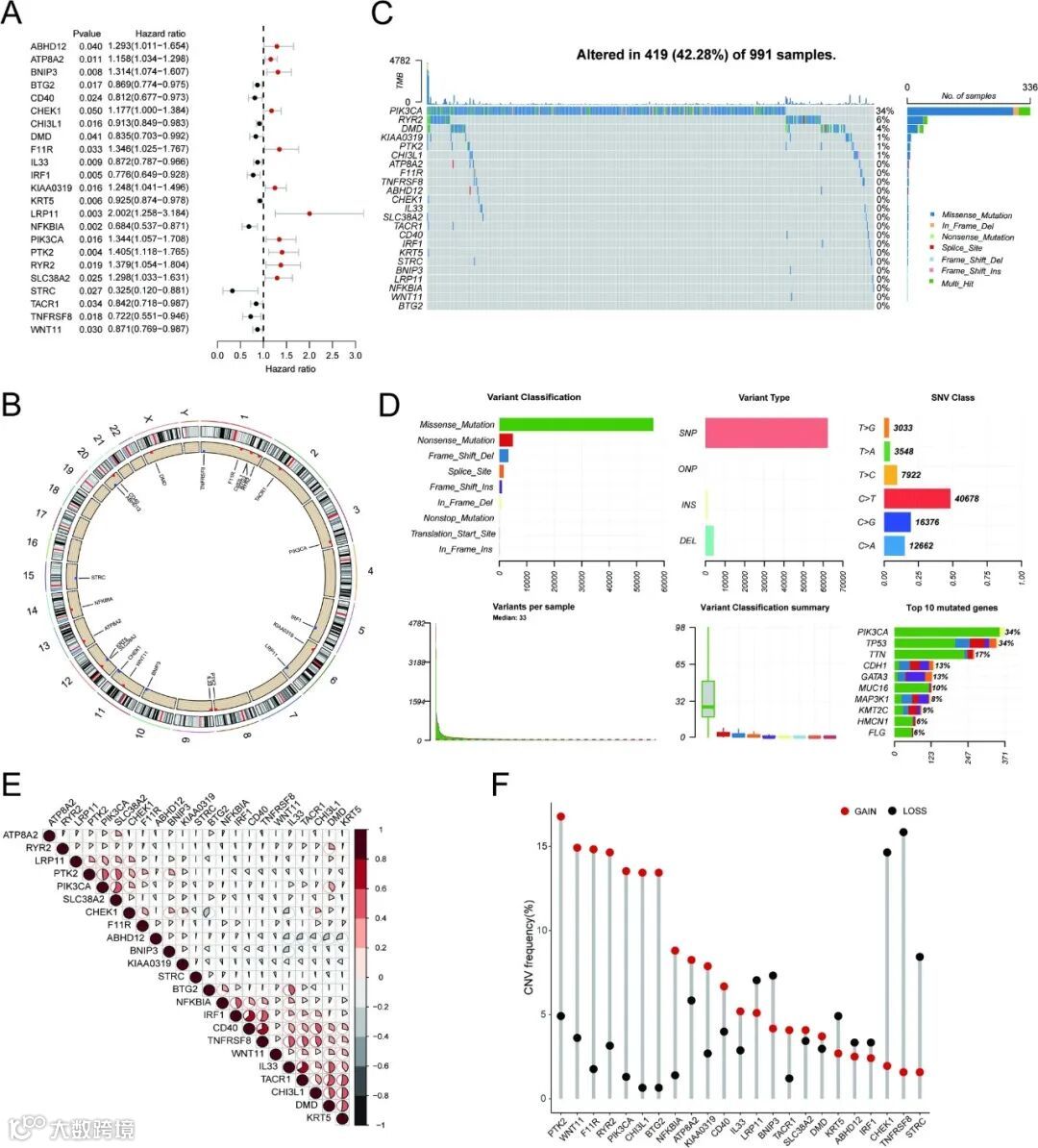 图2 乳腺癌患者中与总生存期相关的机械刺激相关基因(MSRG)变异图谱