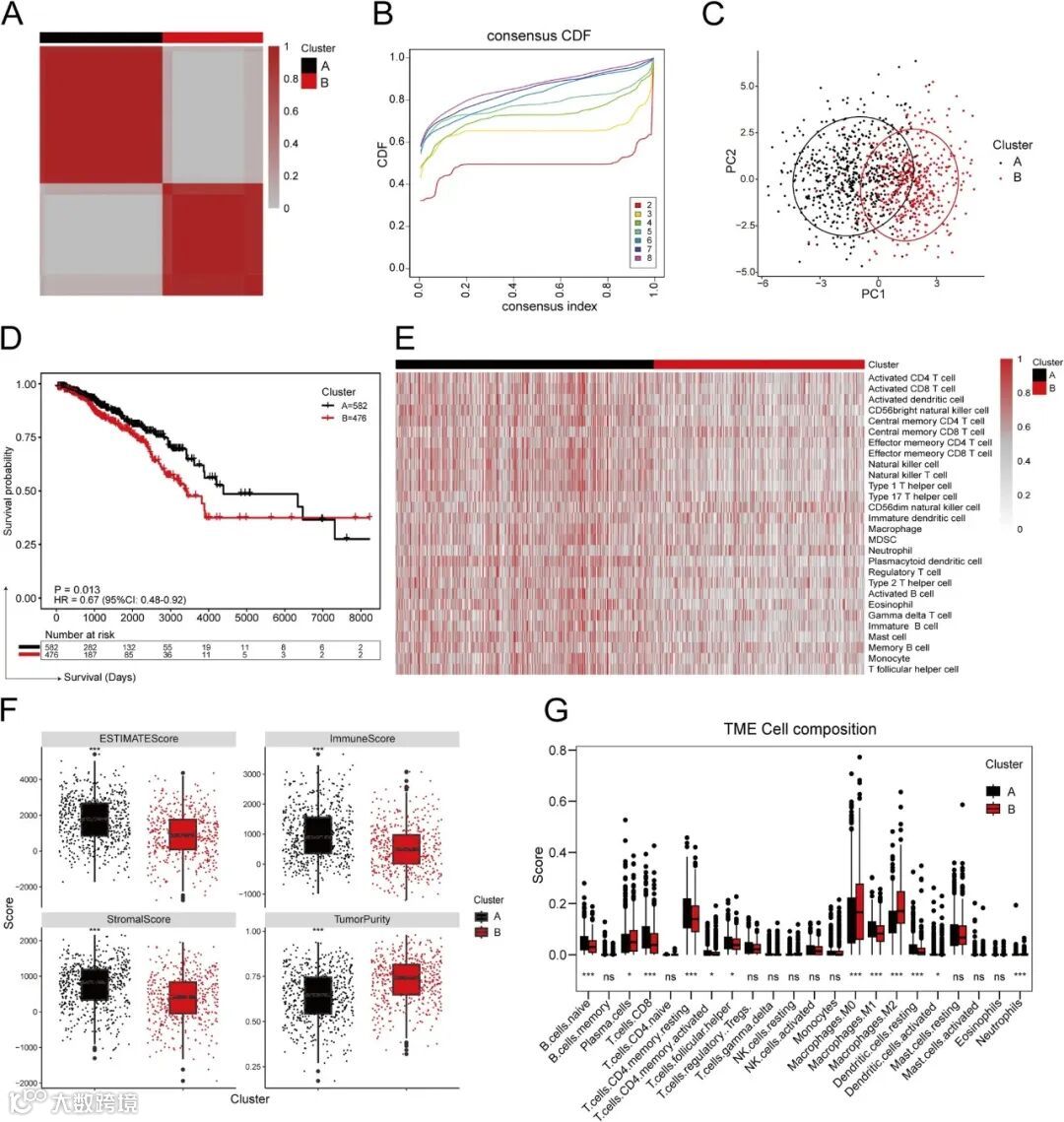 F两个聚类亚组间总评分、基质评分、免疫评分及肿瘤纯度的差异比较,统计学方法:Wilcoxon检验,*p<0.05;**p<0.01;***p<0.001