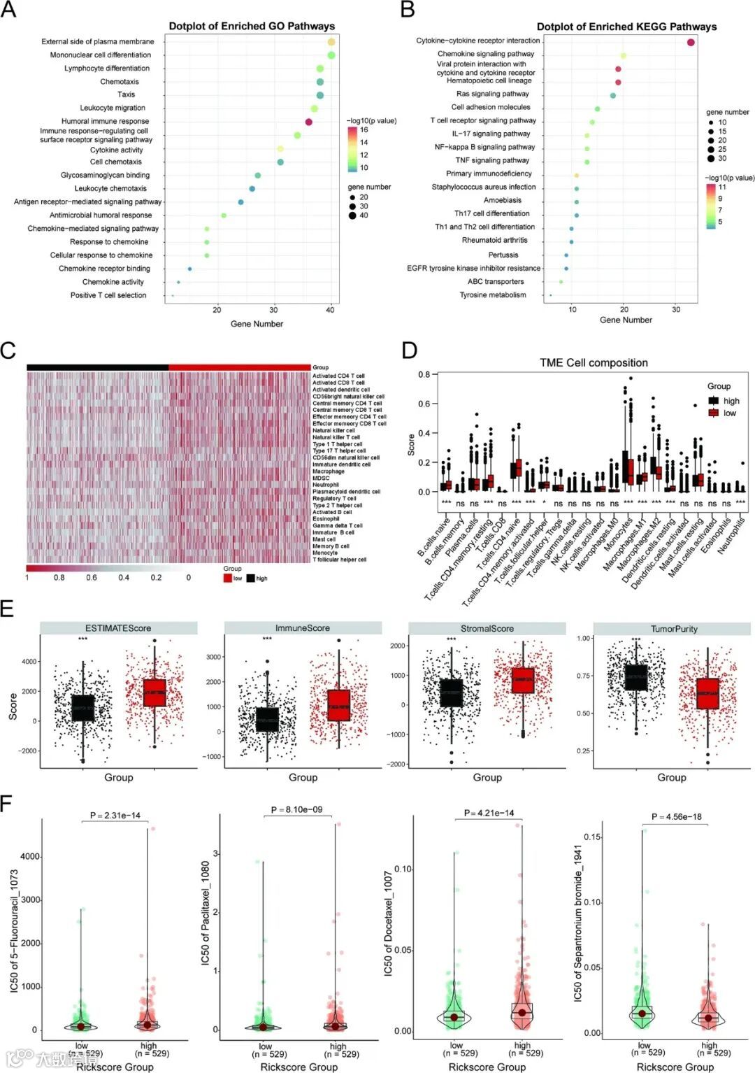 图6肿瘤免疫微环境分析及药物敏感性预测