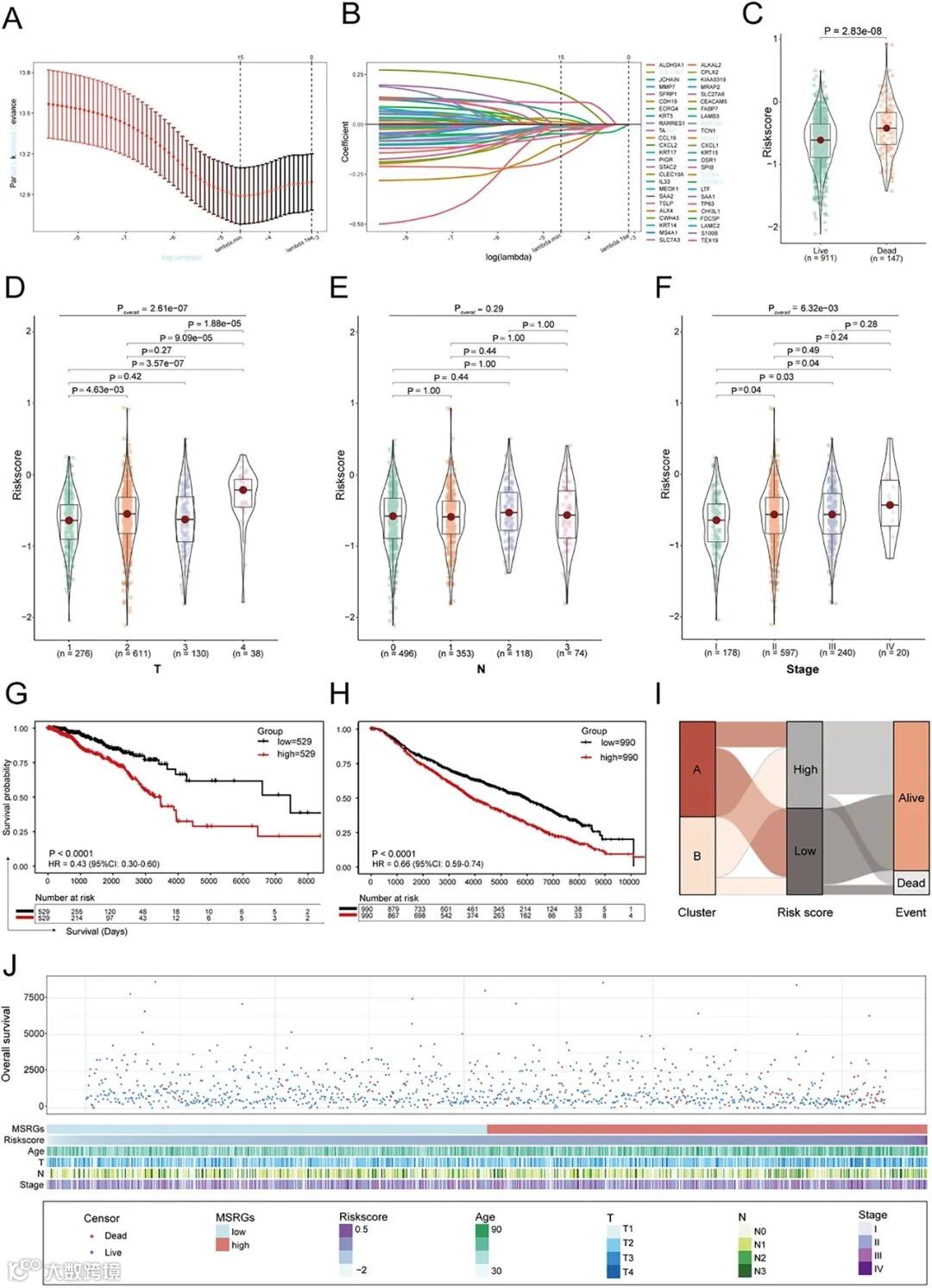H METABRIC队列乳腺癌患者高低风险评分组的Kaplan-Meier生存曲线,统计学方法:两阶段分析