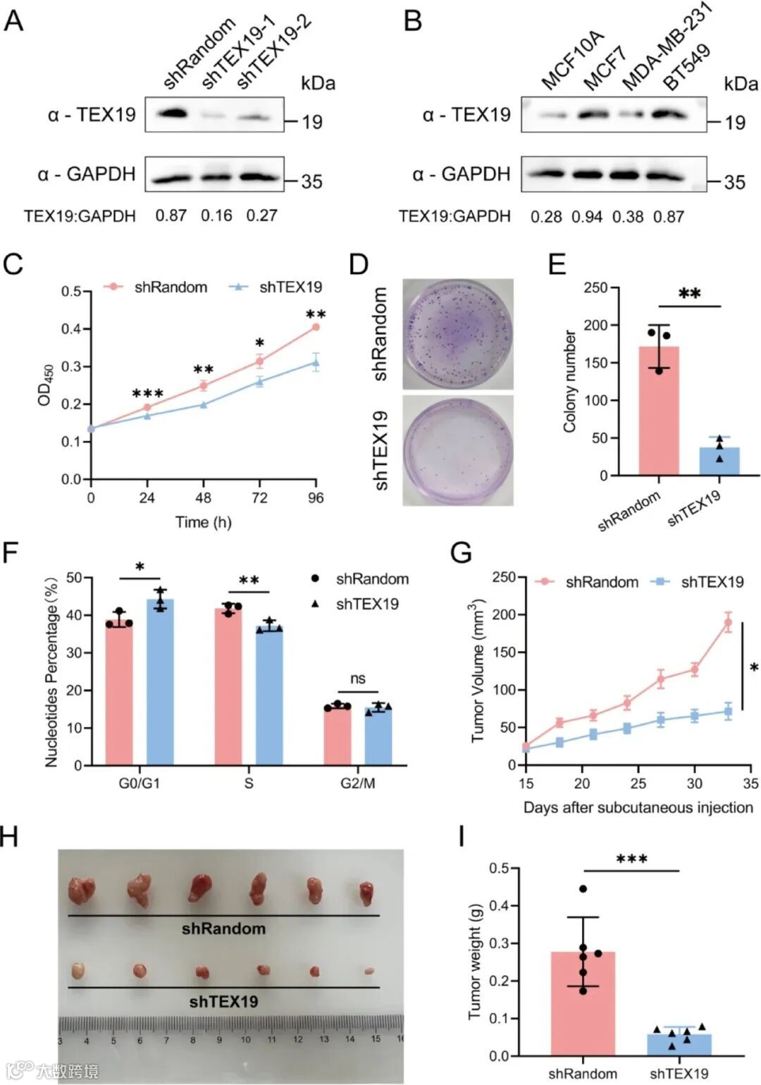 A蛋白质印迹法检测TEX19敲除(shTEX19)及对照(shRandom)MCF-7细胞中TEX19与内参GAPDH的蛋白表达水平