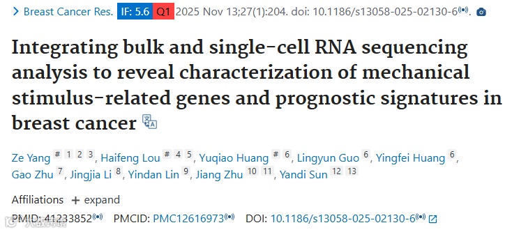 今天小编要和大家分享的这篇文章是2025年11月发表在《Breast Cancer Res》(IF:5.6)期刊上的文章《Integrating bulk and single-cell RNA sequencing analysis to reveal characterization of mechanical stimulus-related genes and prognostic signatures in breast cancer》。以下是这篇文章的主要亮点,一起跟着小编来看一下叭~