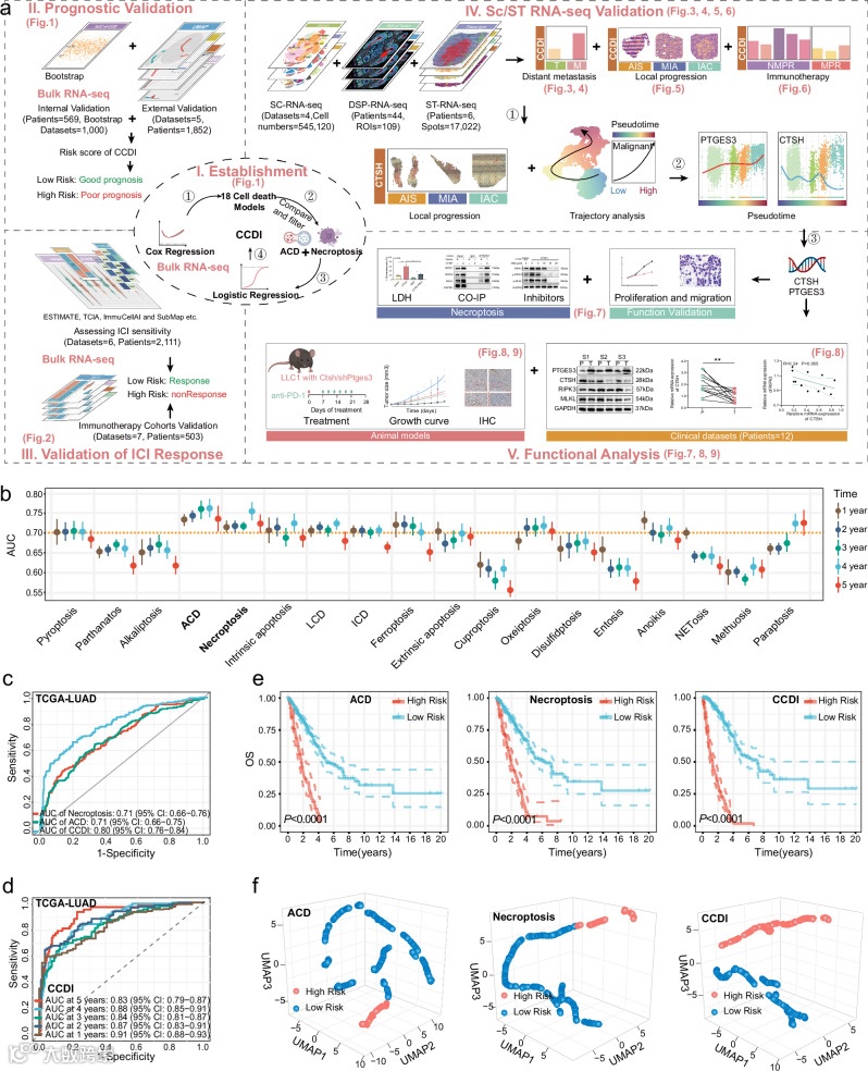 通过整合多组学数据与实验验证,系统构建并评估了用于非小细胞肺癌(NSCLC)的新型预后与治疗预测模型。研究方法上,首先基于TCGA队列,利用18种程序性细胞死亡(PCD)相关基因构建了“联合细胞死亡指数(CCDI)”;进而通过多个独立RNA-seq队列、单细胞与空间转录组数据,以及细胞与动物实验,对模型进行了多维度验证。核心结果显示:CCDI能有效区分患者预后(高风险组生存期更短)并预测免疫治疗反应(低评分者应答更好);单细胞分析揭示CCDI随肿瘤恶性进展而升高;机制上,CTSH过表达或PTGES3敲低可诱导坏死性凋亡,抑制肿瘤生长;动物实验进一步证实,诱导此种死亡方式能显著增强抗PD-1疗法的疗效。该研究不仅提出了一个稳健的NSCLC生物标志物CCDI,还阐明了其通过调控坏死性凋亡影响肿瘤免疫微环境的机制,为提升免疫治疗疗效提供了新的联合策略靶点。